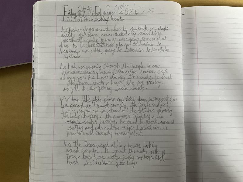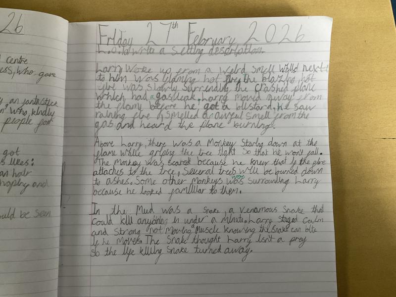 This week we have begun reading the fantastic book: The Explorer. In the book, there is a terrible plane crash and the children are left to survive on their own. Y6 have written a setting description as one of the characters, describing the first scene they see when they awake after the plane crash. Please enjoy our fabulous writing full of adjectives, fronted adverbs and descriptive language.