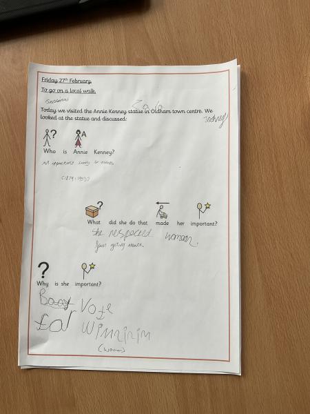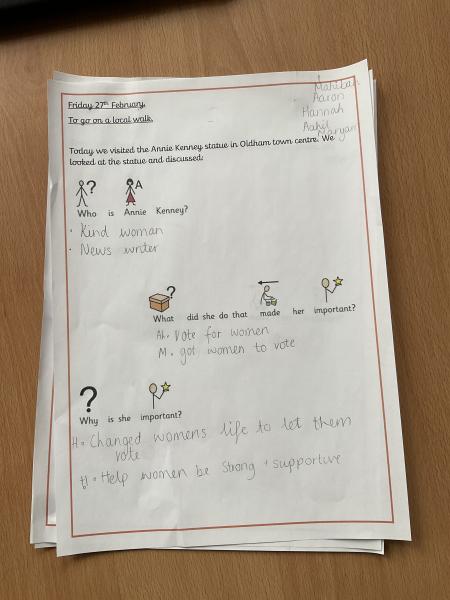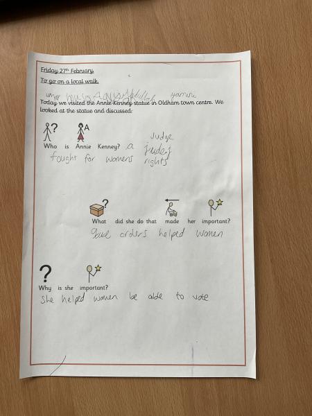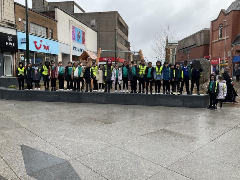 We went on our local walk trip to Oldham Town Centre. We went to look at the Annie Kenney statue and we predicted who she was and why she was important! The children used the clues of her sash and newspaper to predict she helped women get to vote.