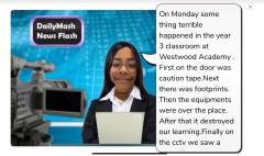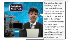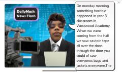 Today in class we took on the roles of Newsreporters but reporting on the horrific crocodile break in that happened in our classroom on Monday. We had to tell our audience when it happened, what happened and what evidence we had in our classroom! Everyone was clear and confident with their presenting.