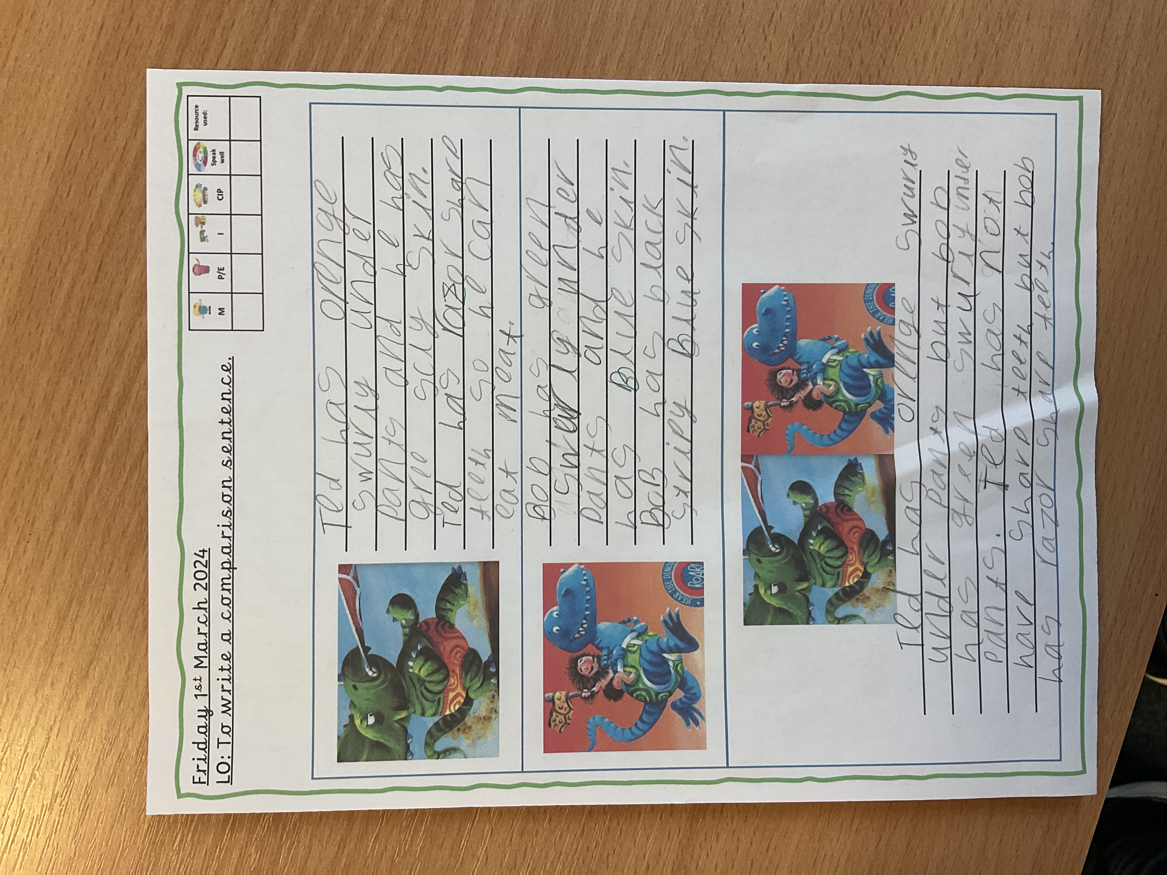 This week in Year 1, we started our History topic- 'Digging for Dinosaurs'. In English, we have been reading 'Dinosaurs Love Underpants. We described Bob and ted from the story and compared them using the conjunction 'but'.