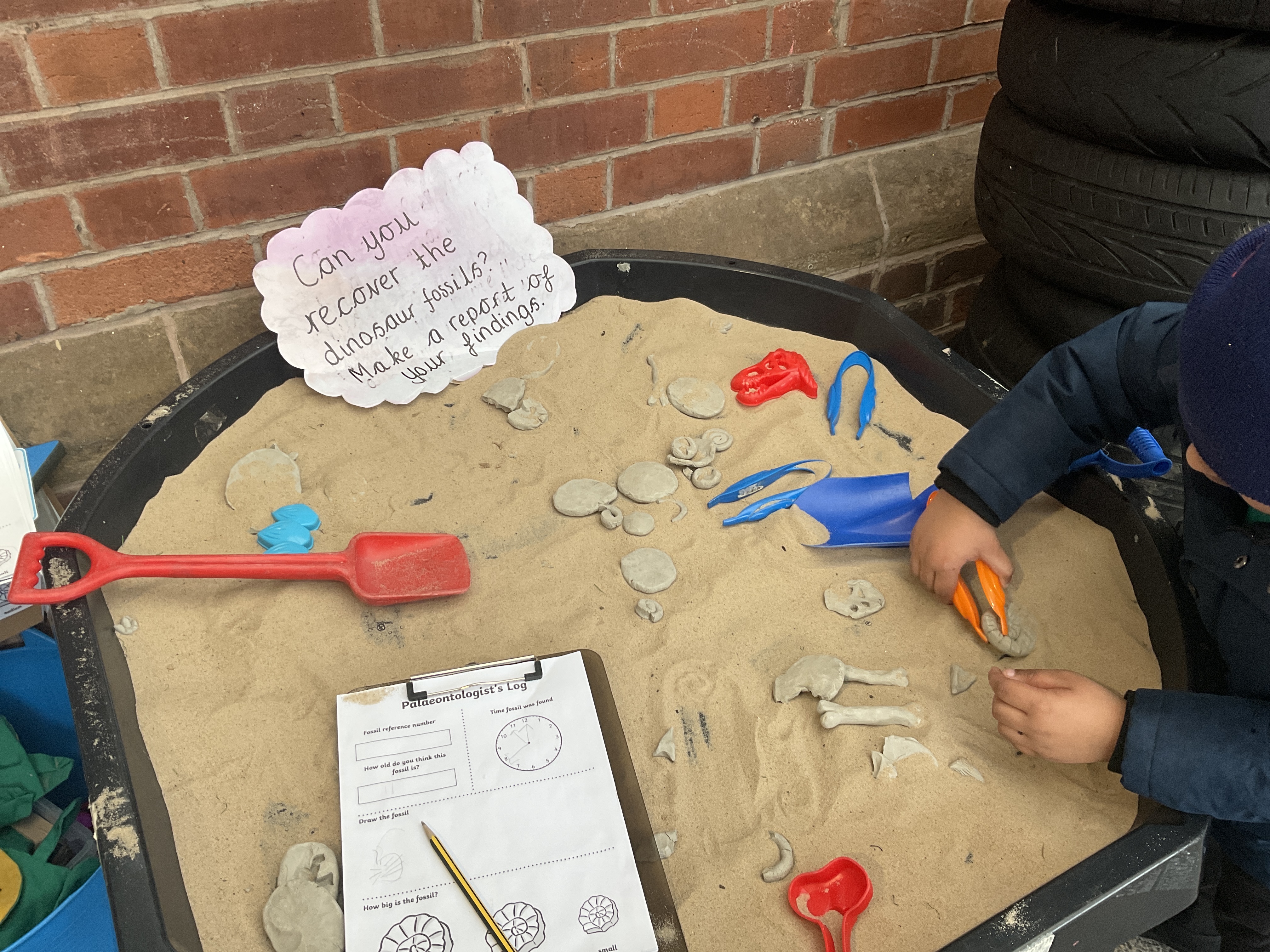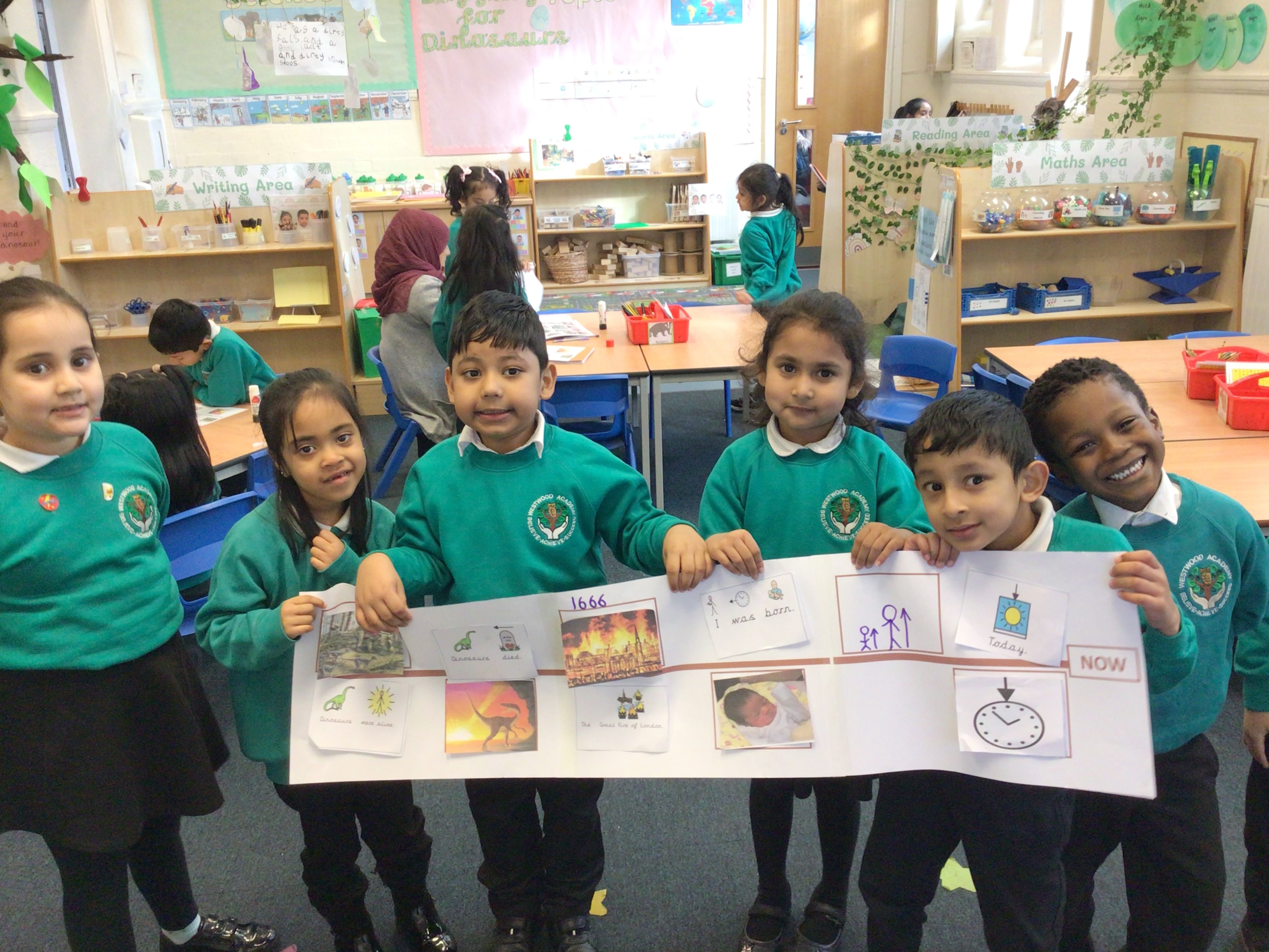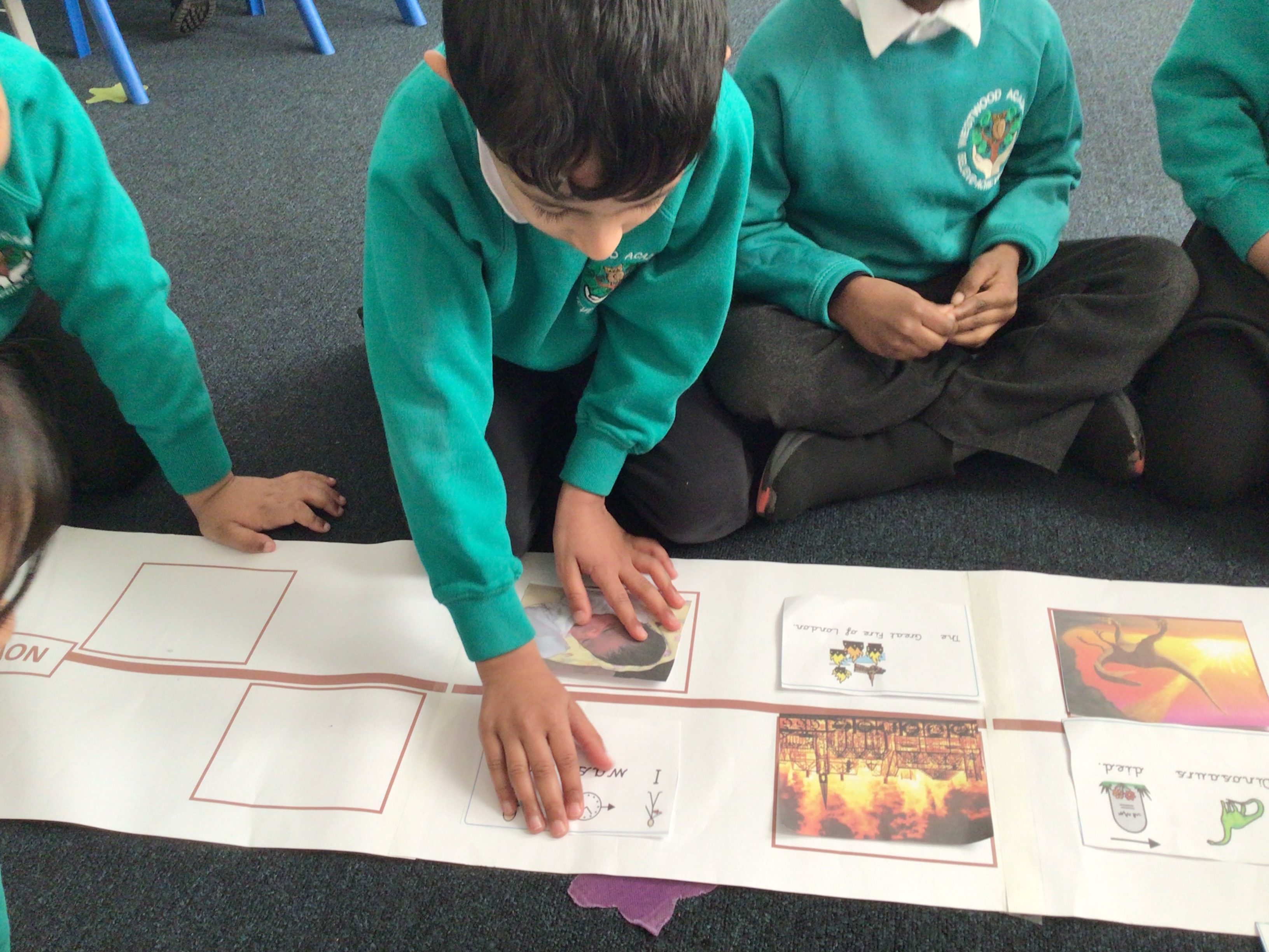 In History, we ordered a timeline of events we already know from beyond our living memory. We also had lots of fun in continuous provision as palaeontologists and dinosaur zoo builders!