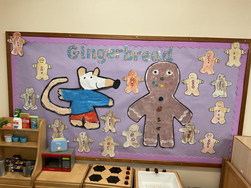 This week as part of our learning about 'food', Nursery read the story 'Maisy makes Gingerbread'. We enjoyed listening to the story and pretending to make our own gingerbread men with the gingerbread playdough. We tasted gingerbread during snack time and joined in lots of activities linked to the story. We worked together to create a giant Maisy and Gingerbread man to display in our classroom. We had a wonderful week in Nursery.