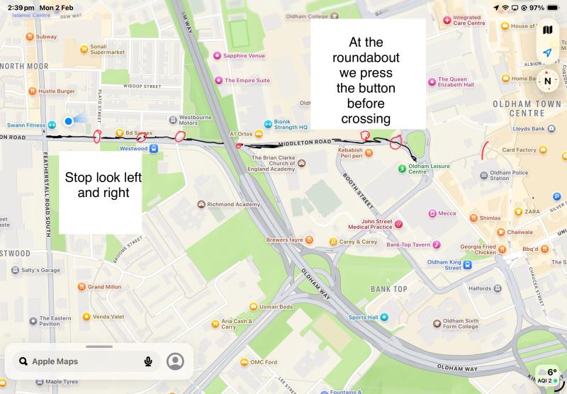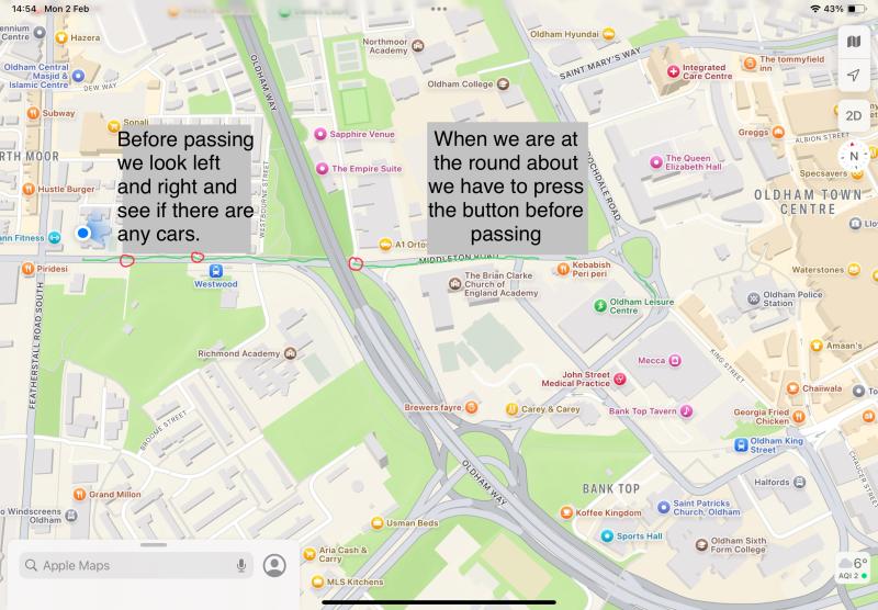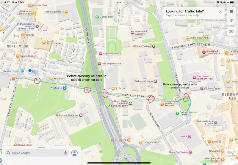 Then in pairs, we looked on google maps to find the route we take. In red we circled the road we have to cross and then thought about the best way to be safe when crossing. Here are some examples of our maps below...