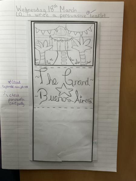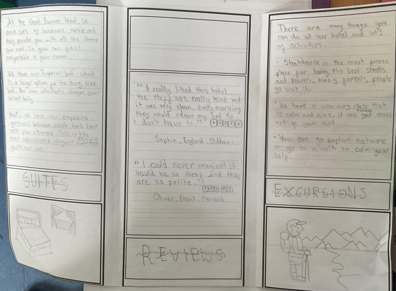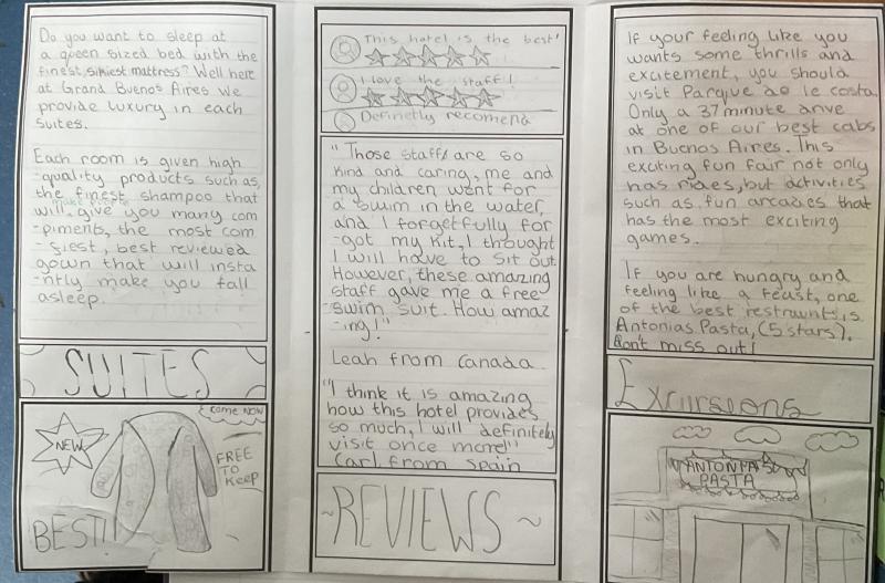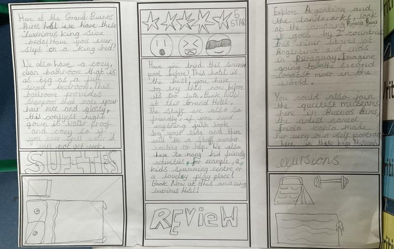 Last week, year 6 really enjoyed writing a persuasive travel brochure, tempting people to come and visit the a hotel in Buenos Aires. The children used a range of persuasive phrases to help them sell their hotel holiday. The children's fantastic designs also helped to persuade people to come to their hotel!